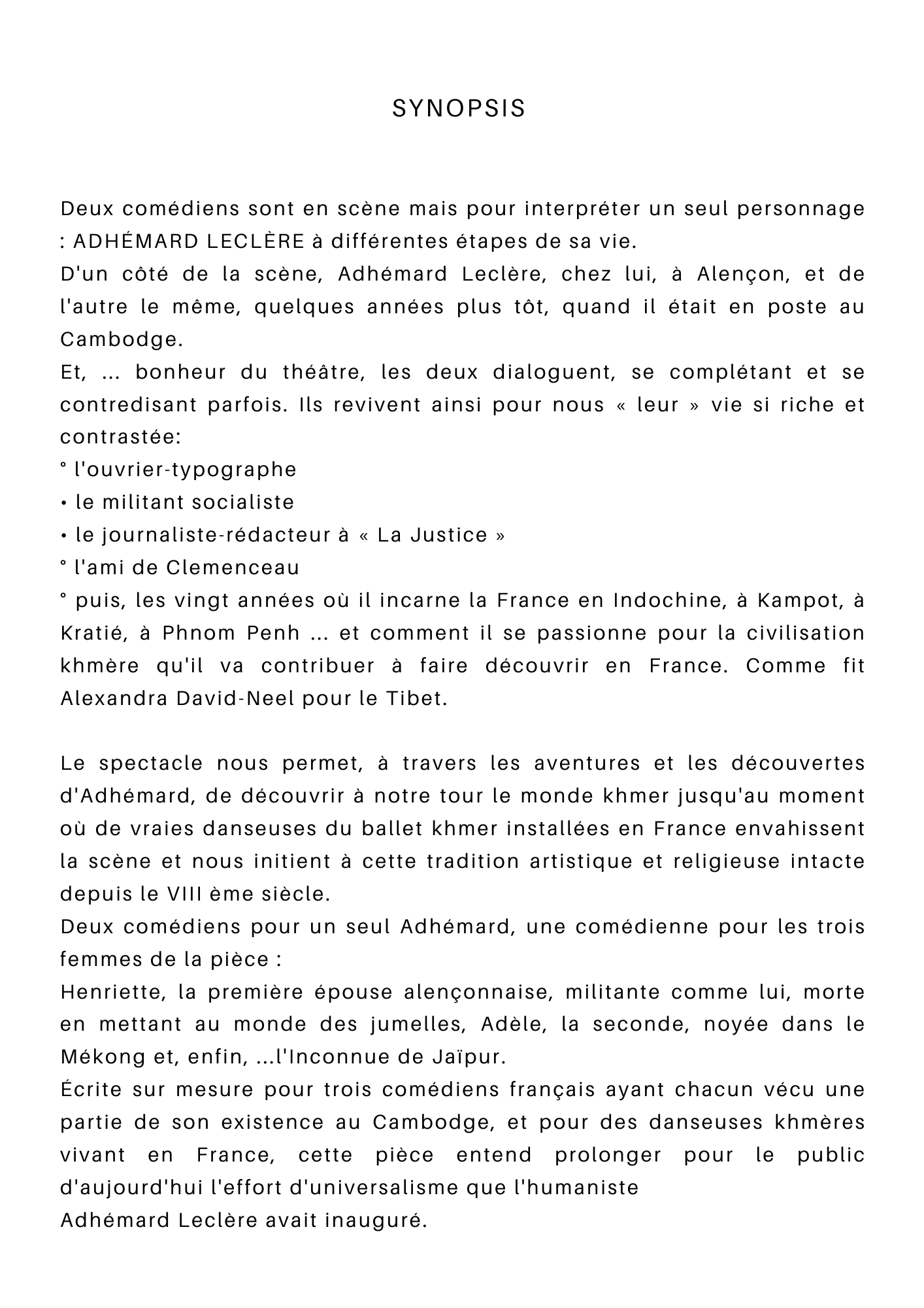 Et, bonheur du théâtre, les deux dialoguent, se complétant et se contredisant parfois. Ils revivent ainsi pour nous « leur » vie si riche et contrastée: l’ouvrier-typographe, le militant socialiste, le journaliste-rédacteur à « La Justice », ‘ami de Clemenceau puis, les vingt années où il incarne la France en Indochine, à Kampot, à Kratié, à Phnom Penh … et comment il se passionne pour la civilisation khmère qu’il va contribuer à faire découvrir en France. Comme fit Alexandra David-Neel pour le Tibet.